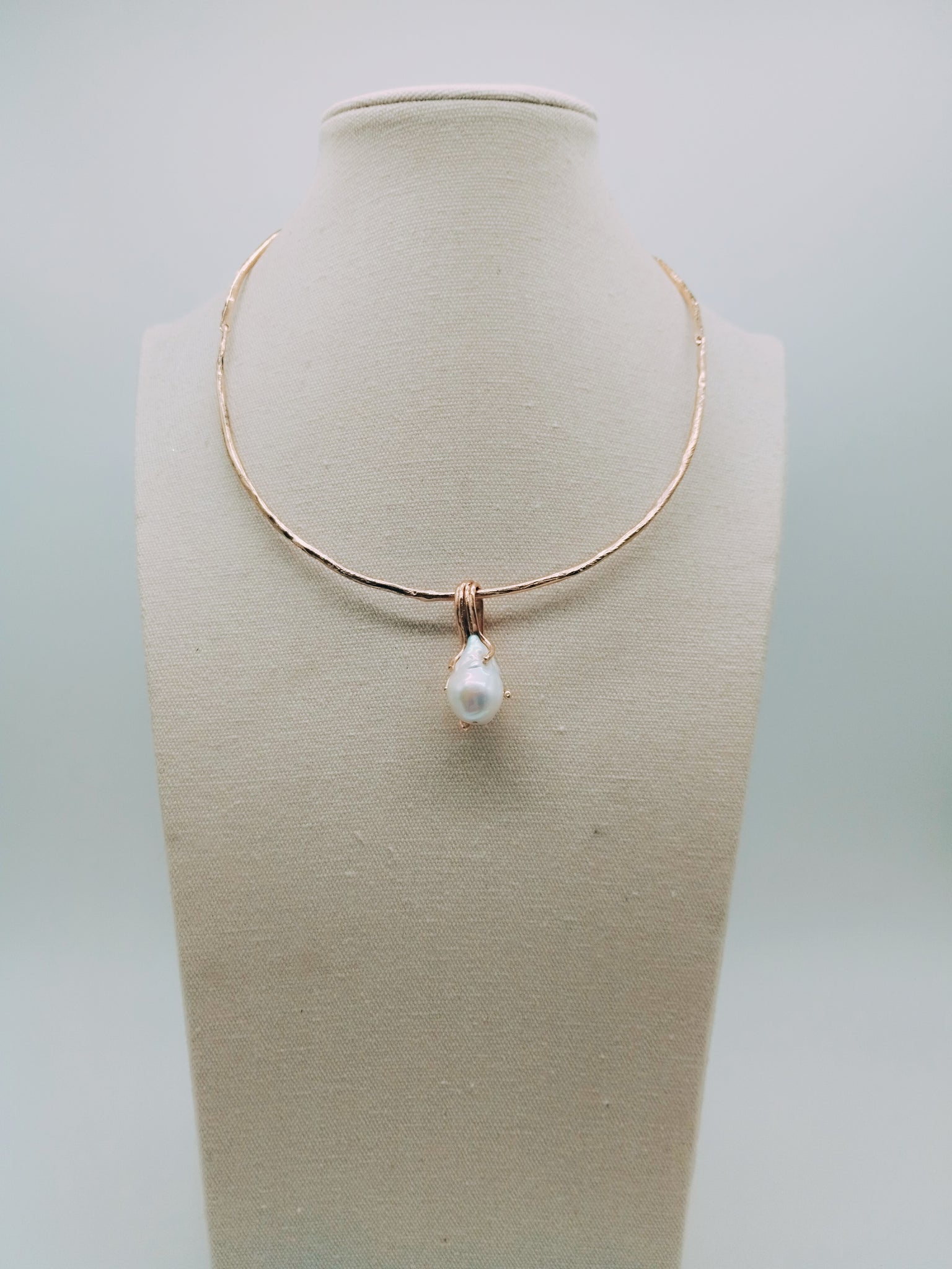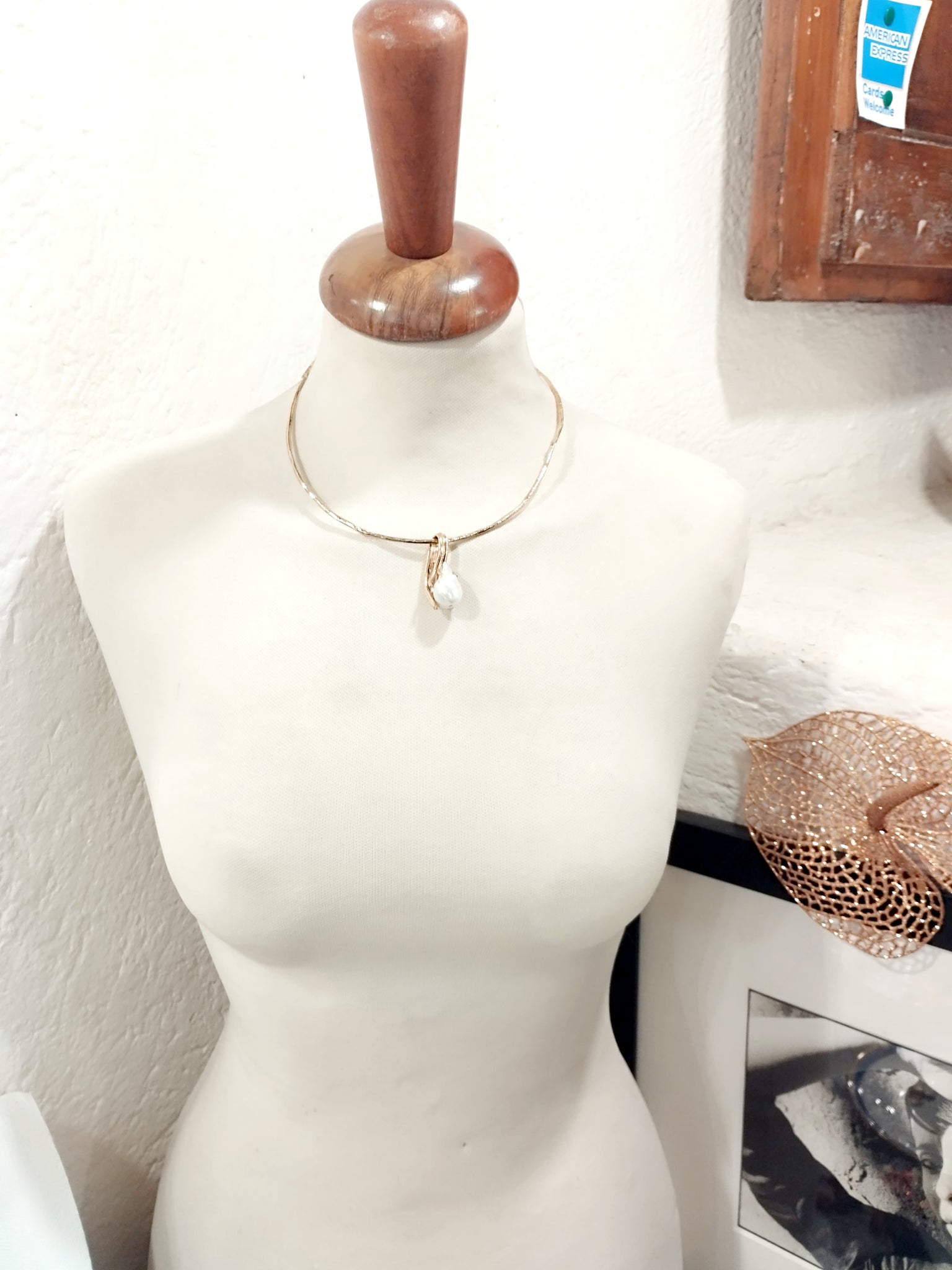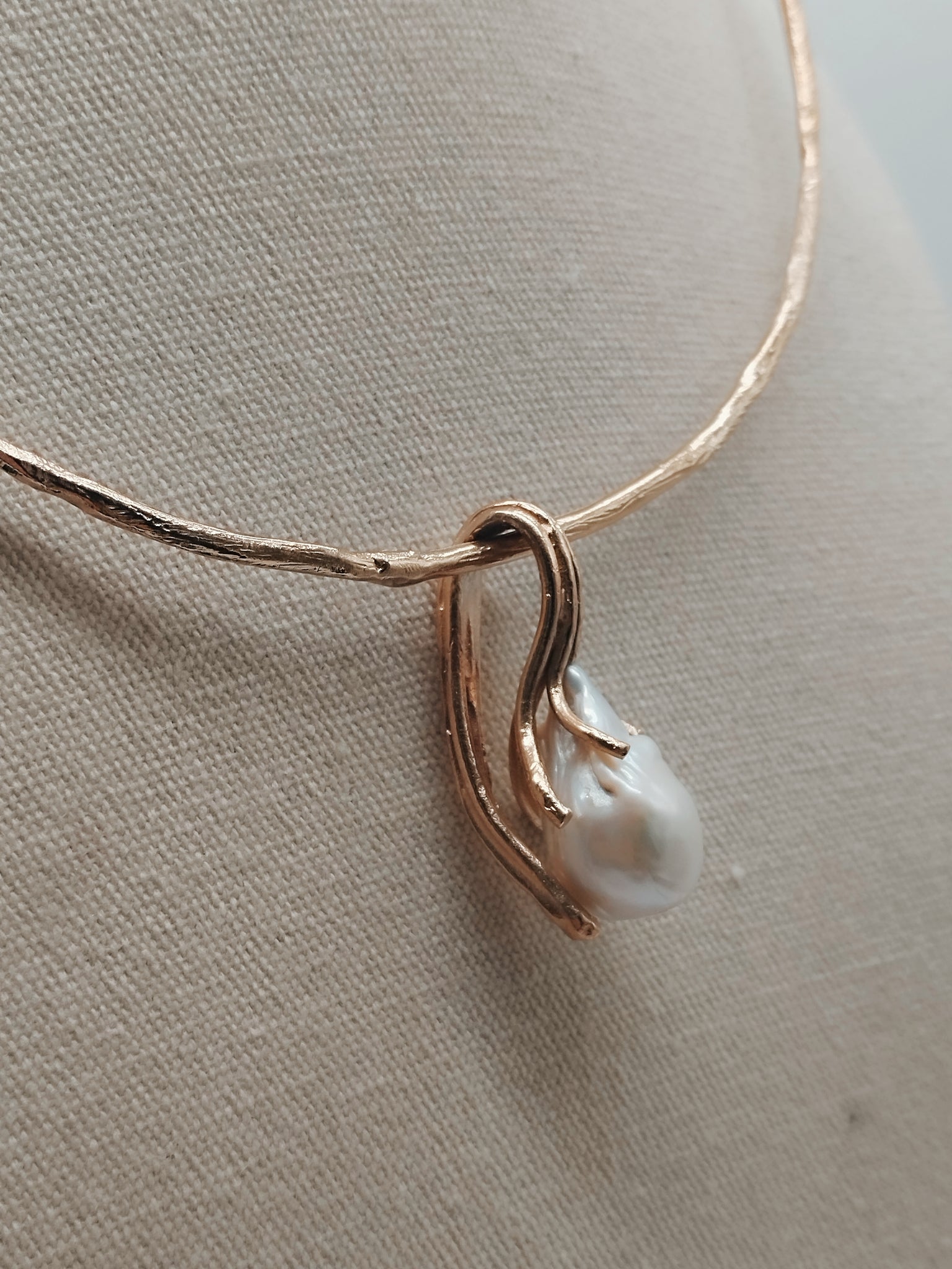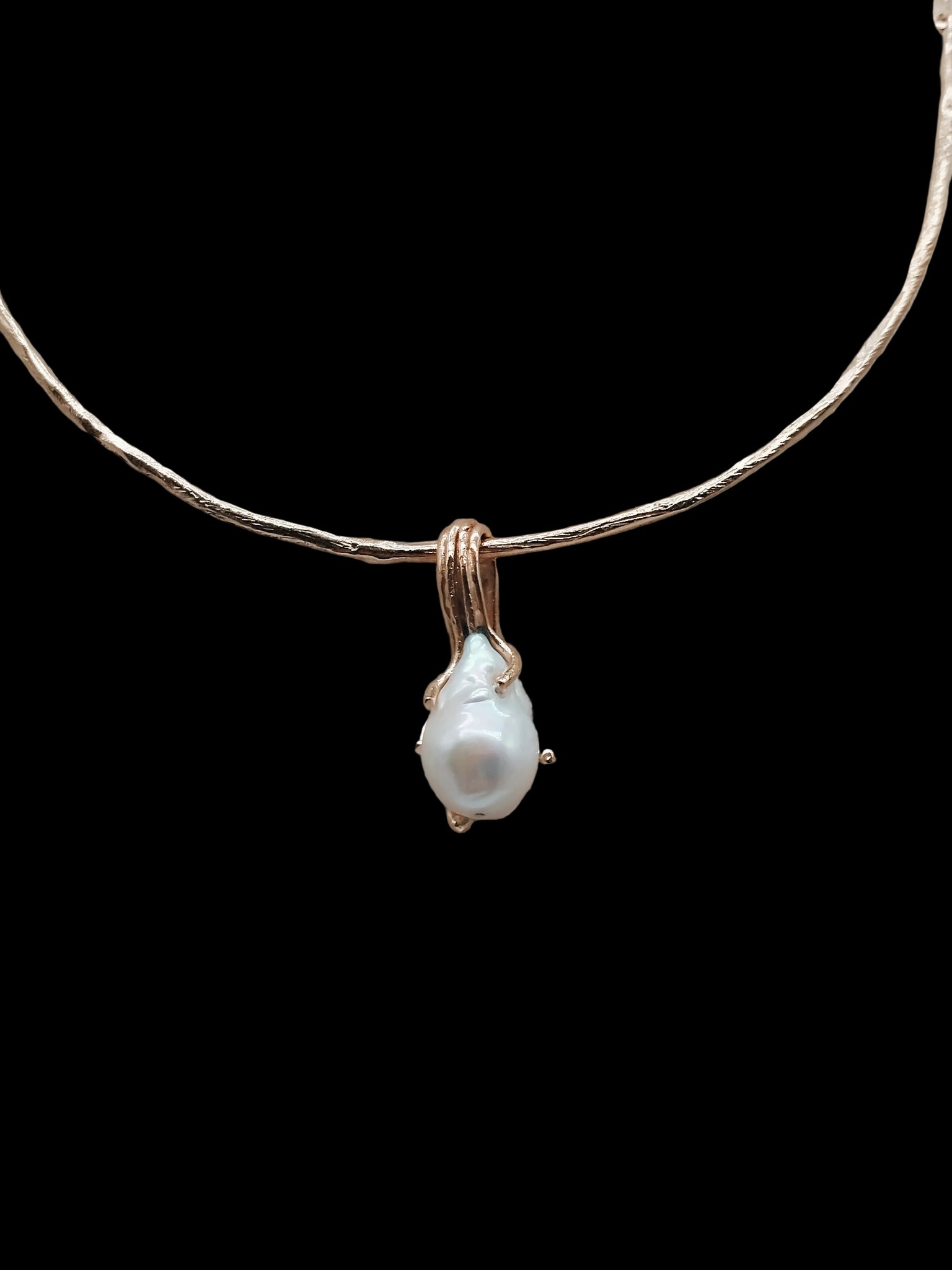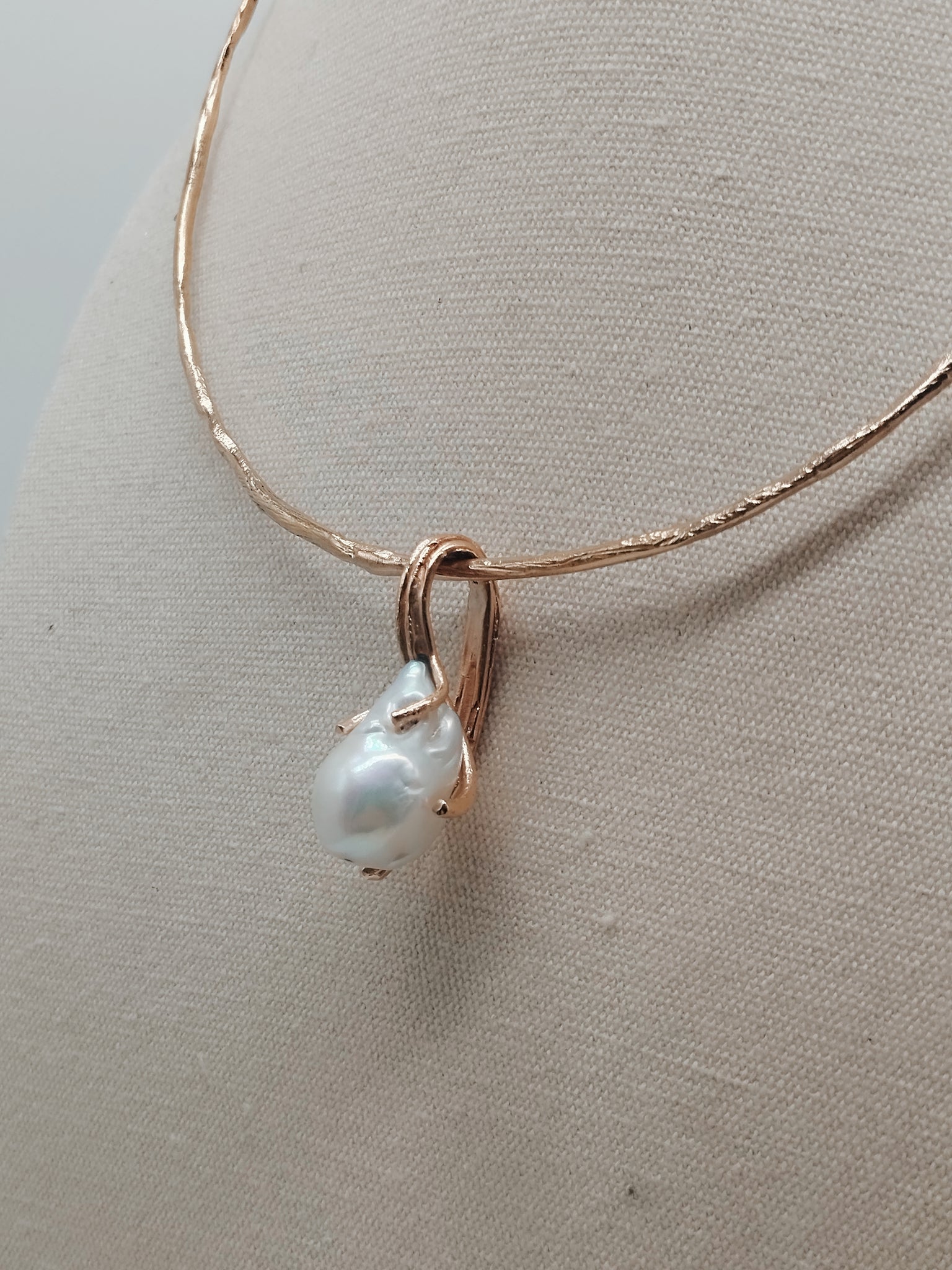 Collana corta in bronzo e perla d' acqua dolce. Lunghezza 40 cm, ciondolo 4 cm x 1,5 cm. Chiusura a uncino