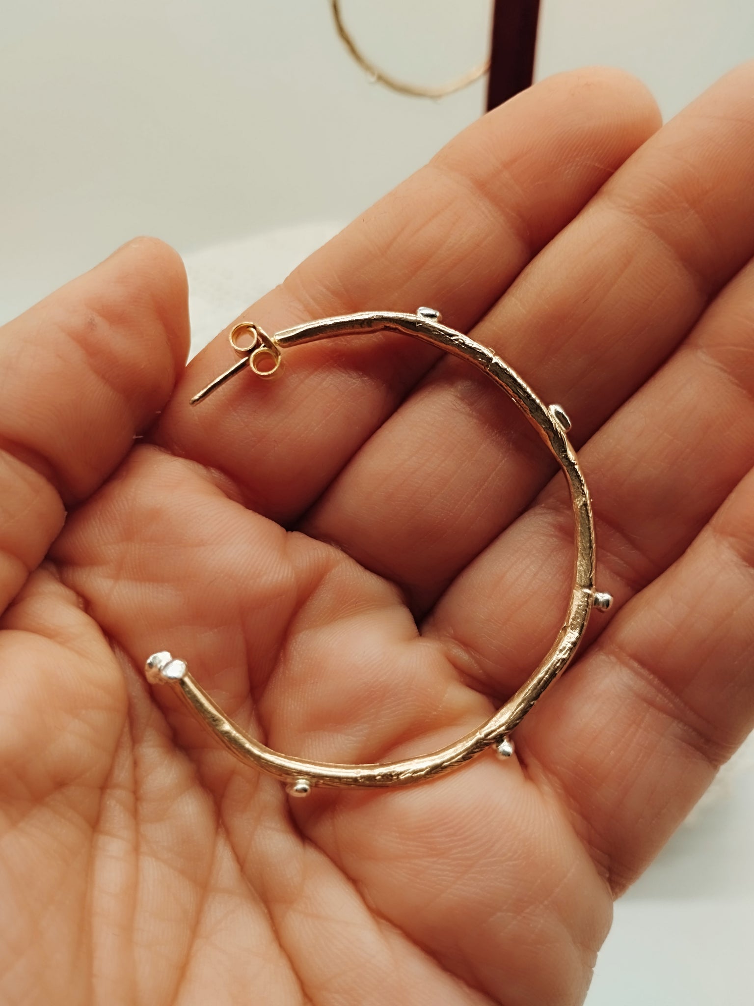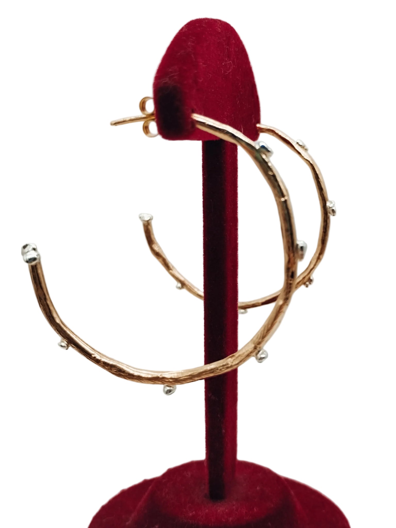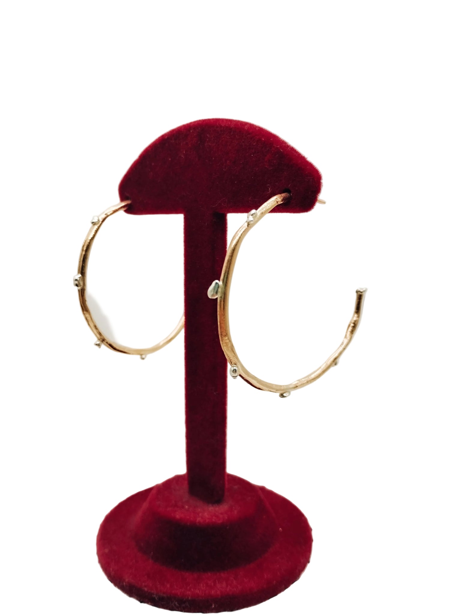 Orecchini leggerissimi con grandi cerchi in bronzo e pepite in argento. Diametro 50 mm.