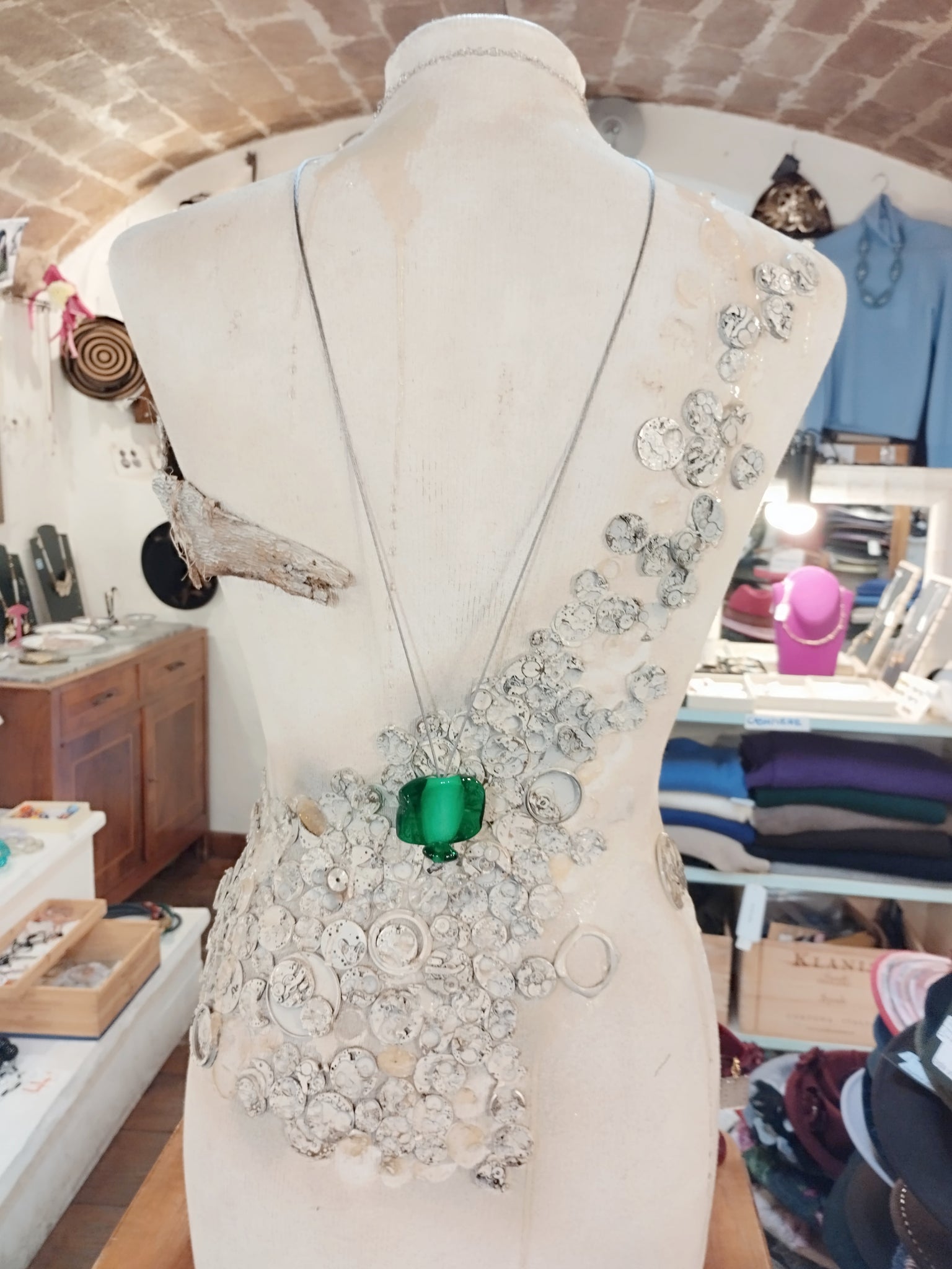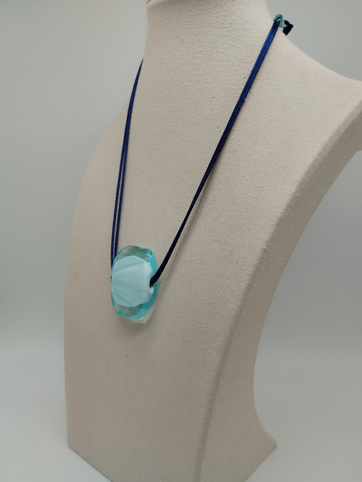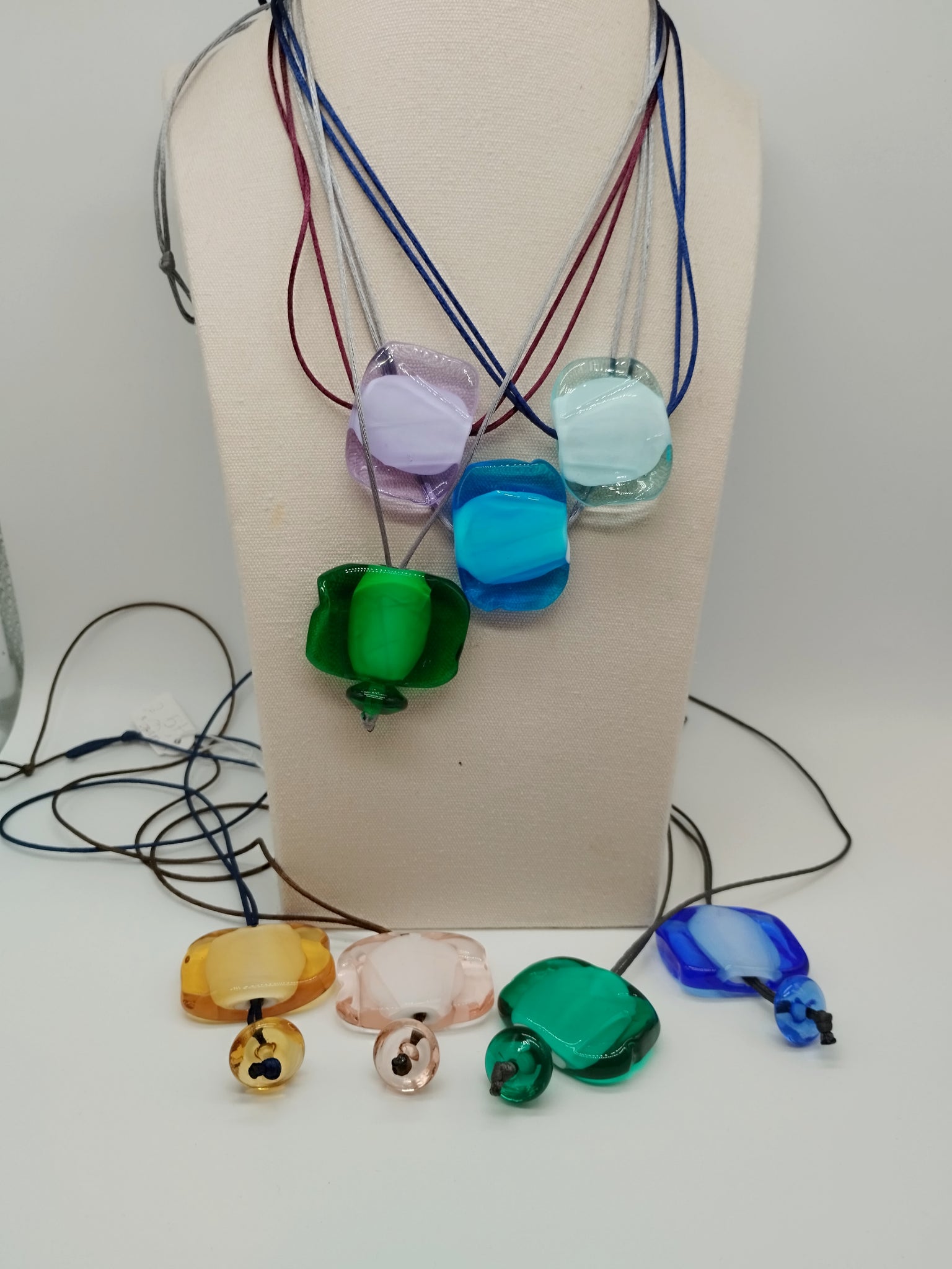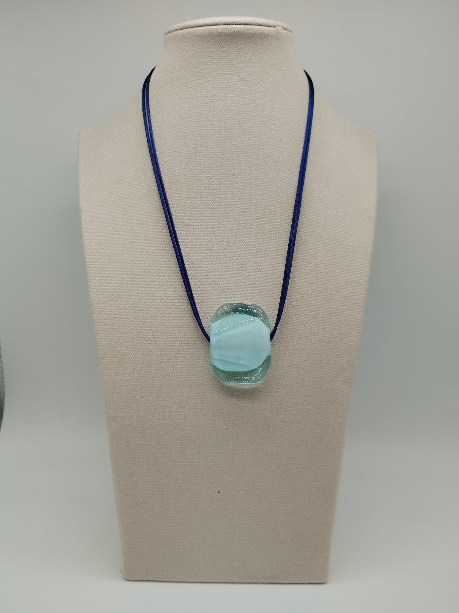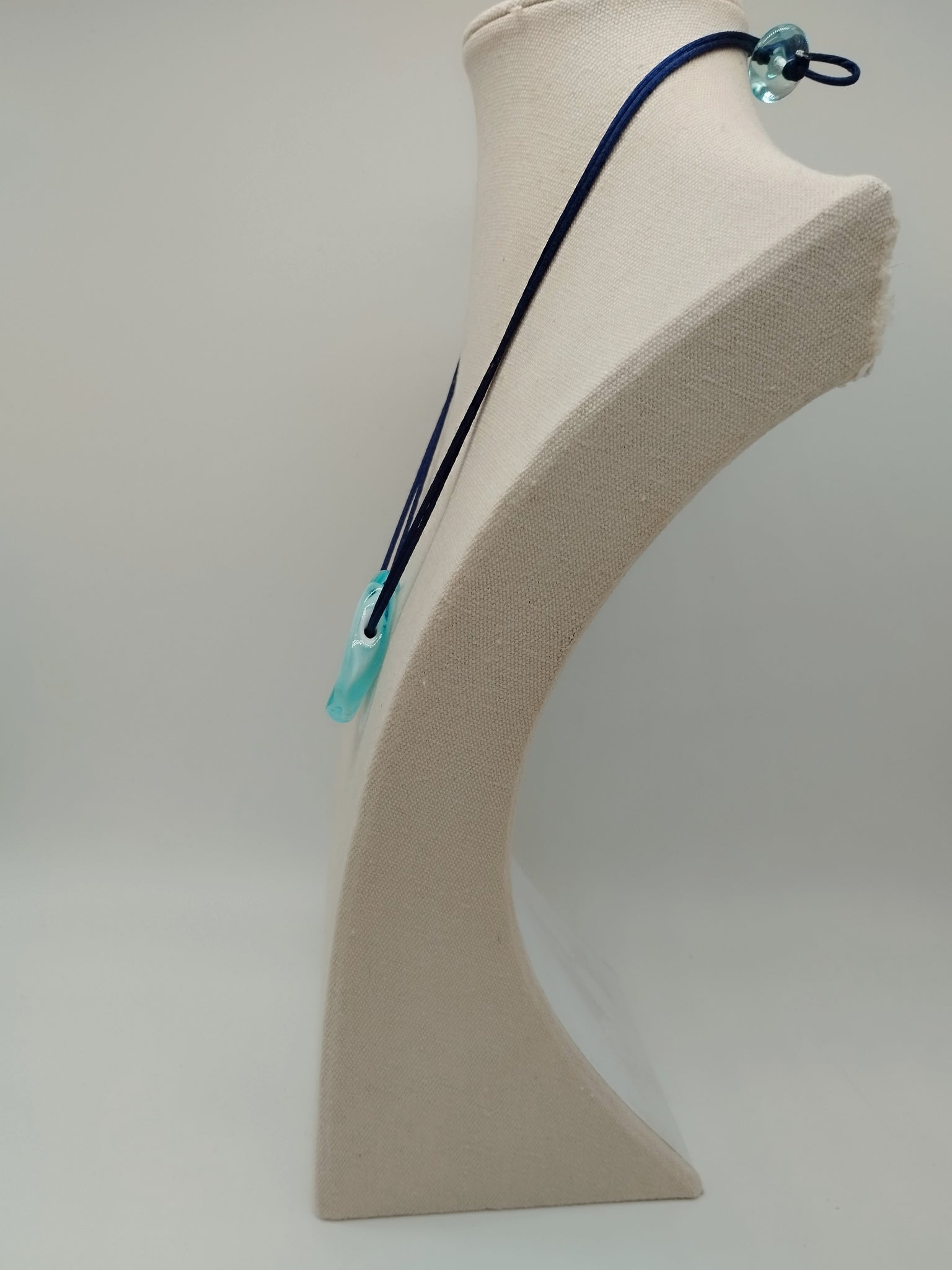 Collana in vetro e tessuto. Lunghezza, nella versione corta sui 48 cm. È  possibile indossarla girocollo oppure portarla lunga, cadrà piu o meno sotto il petto.