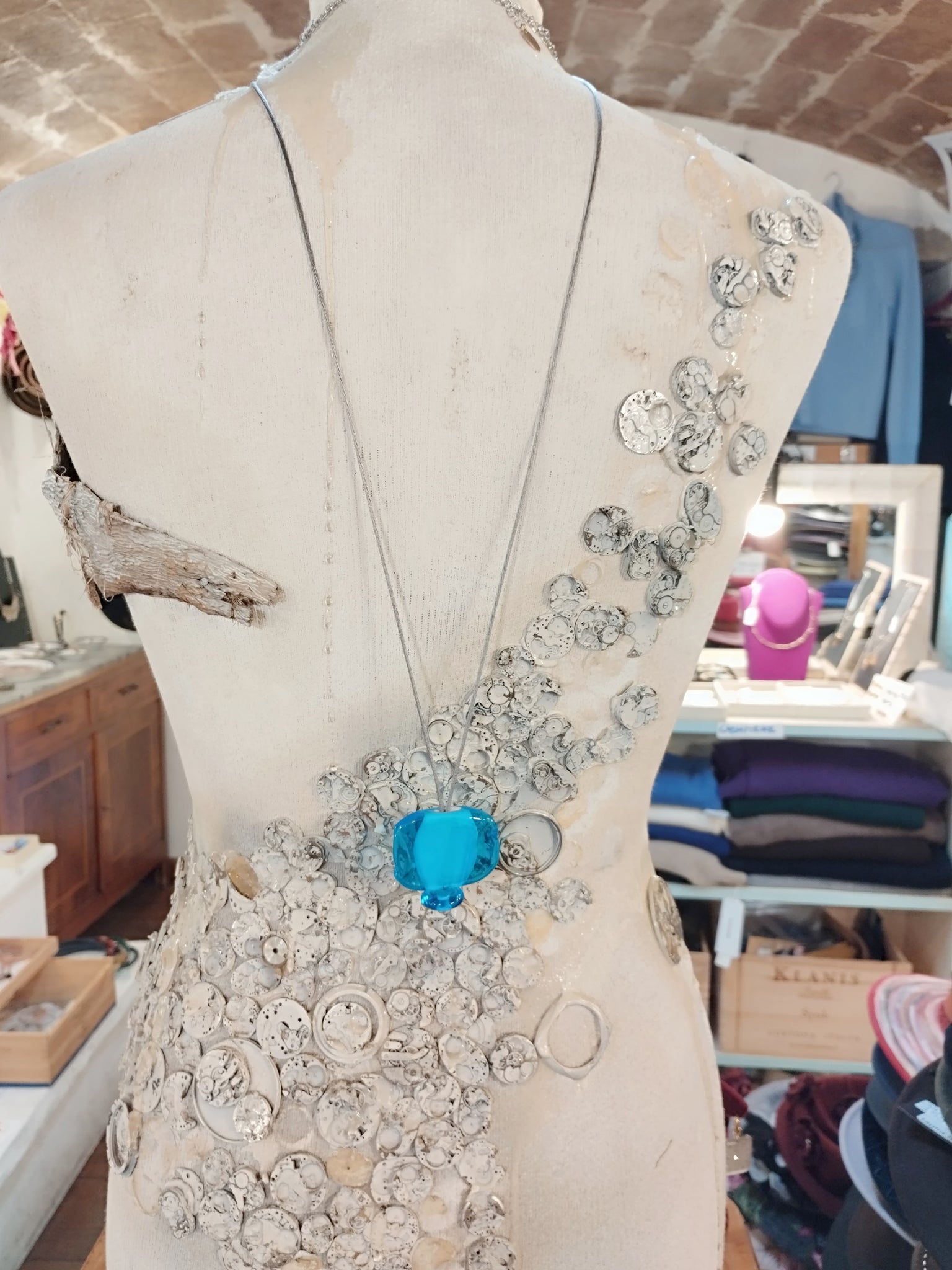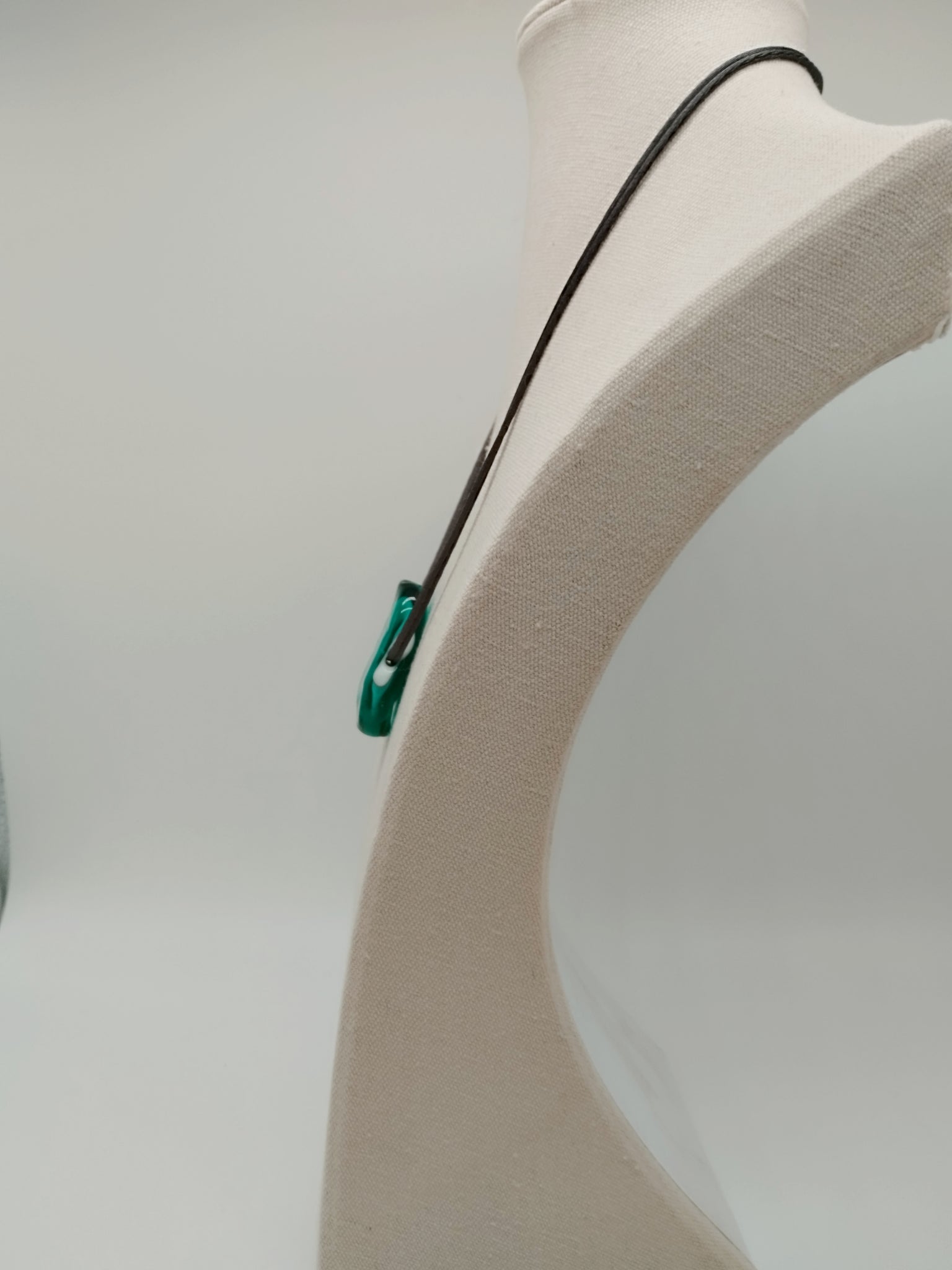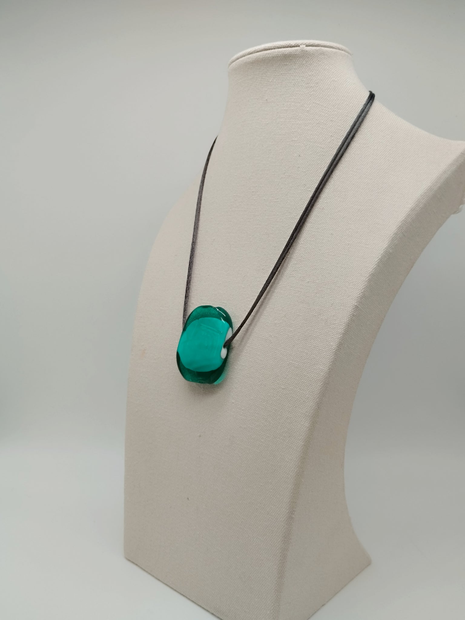 Collana in vetro e tessuto. Lunghezza, nella versione corta sui 48 cm. È  possibile indossarla girocollo oppure portarla lunga, cadrà piu o meno sotto il petto.