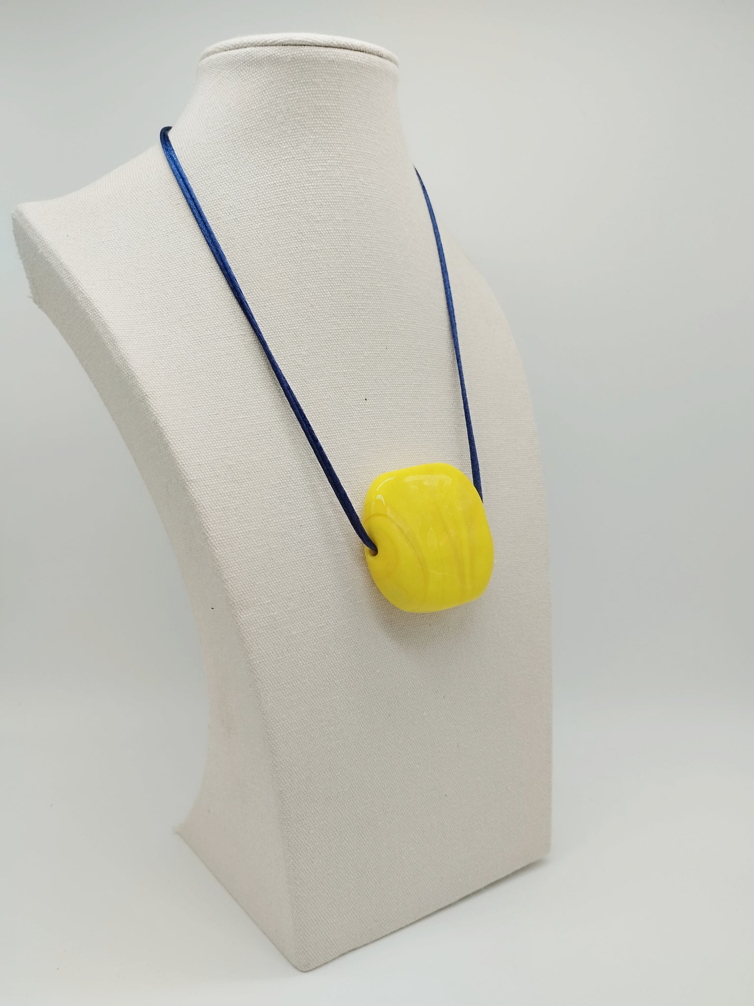 Collana in vetro e tessuto. Lunghezza, nella versione corta sui 48 cm. È  possibile indossarla girocollo oppure portarla lunga, cadrà piu o meno sotto il petto. Dimensione 4,5 cm x 4,5 cm