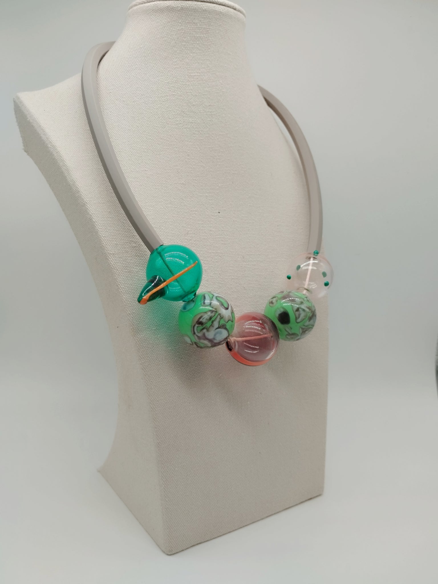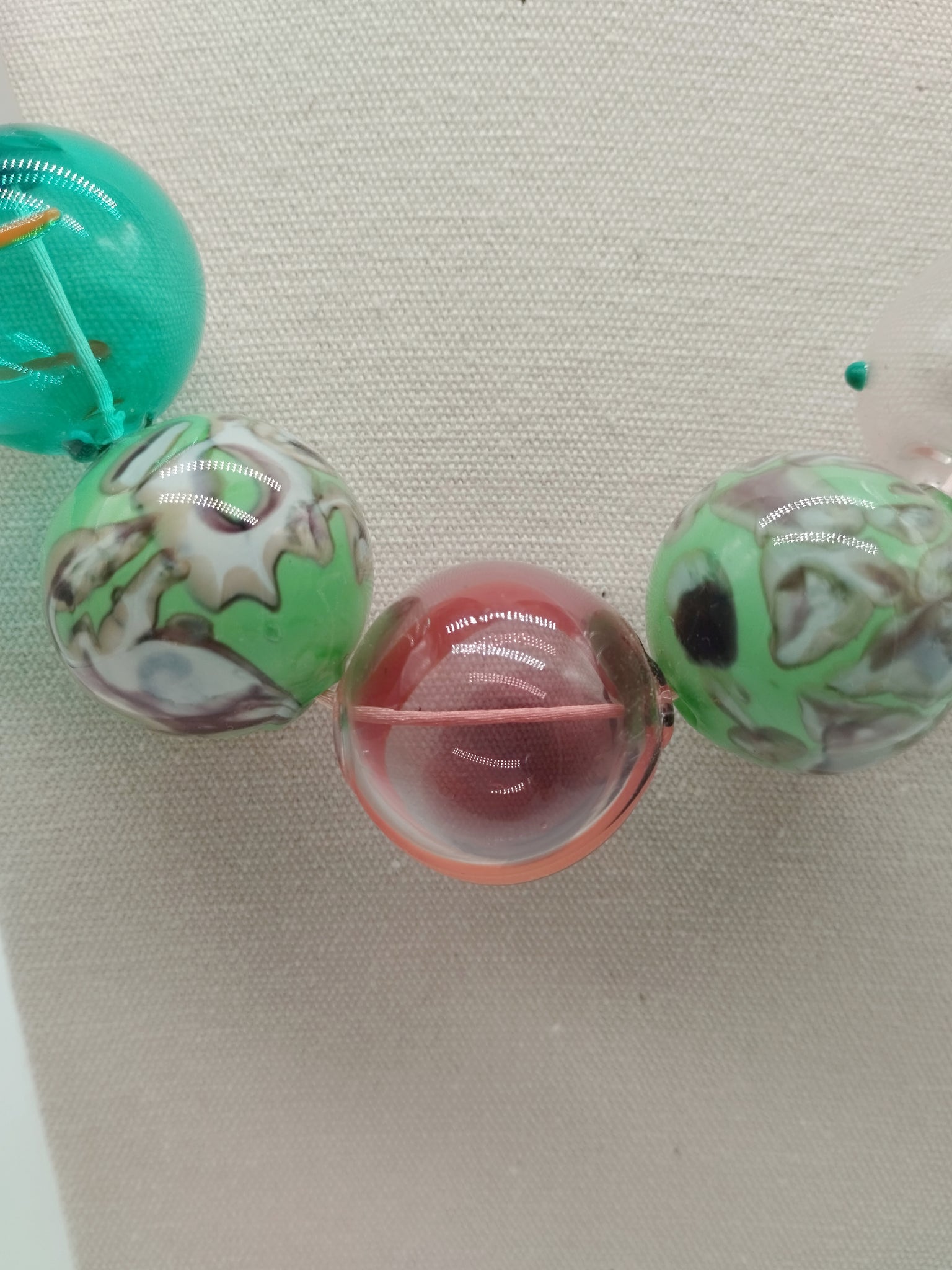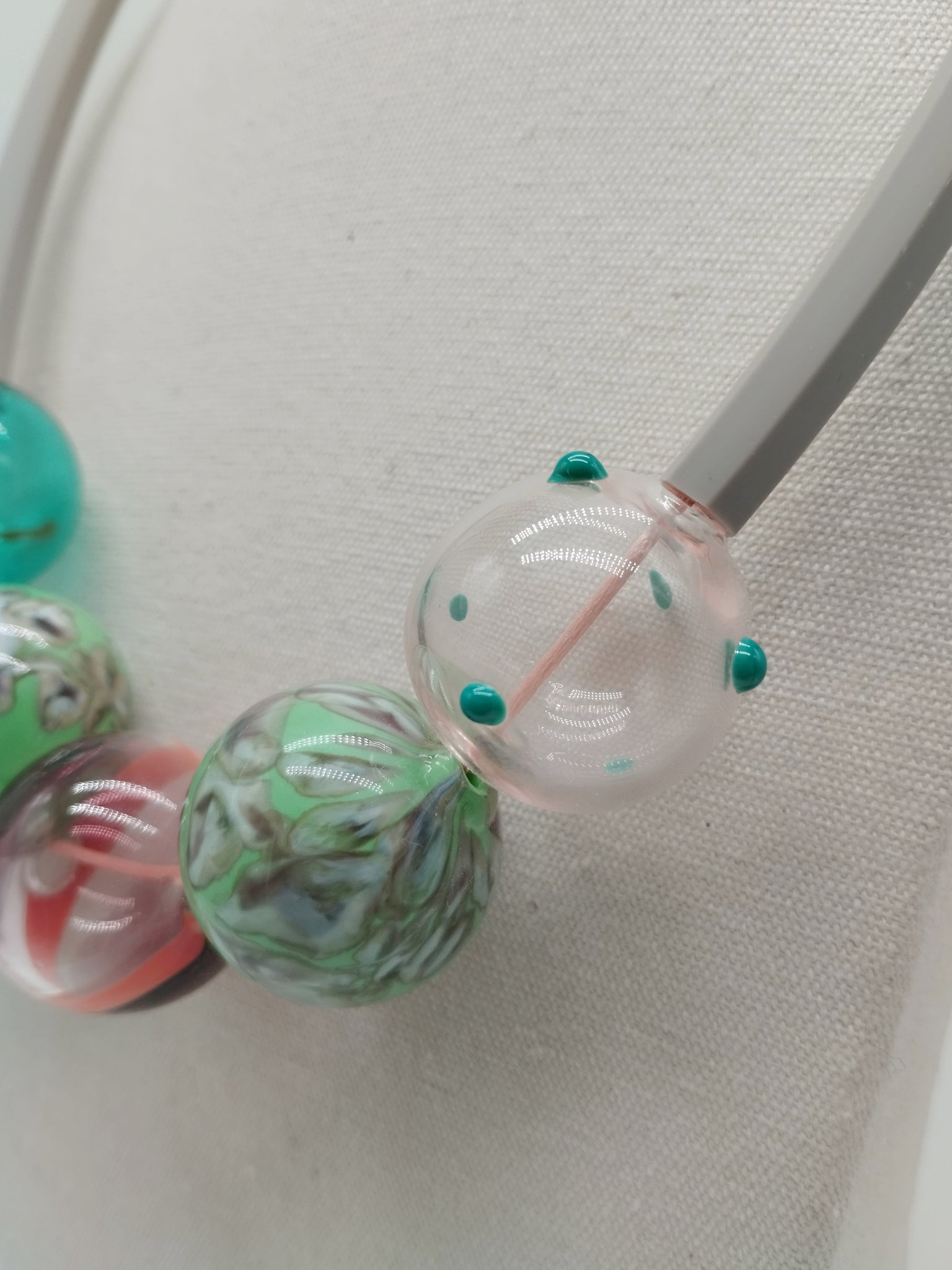 Le sfere in vetro, nonostante siano voluminose, sono leggerissime e non particolarmente fragili. È possibile indossare la collana tutto il giorno,  senza avere disagio al collo.