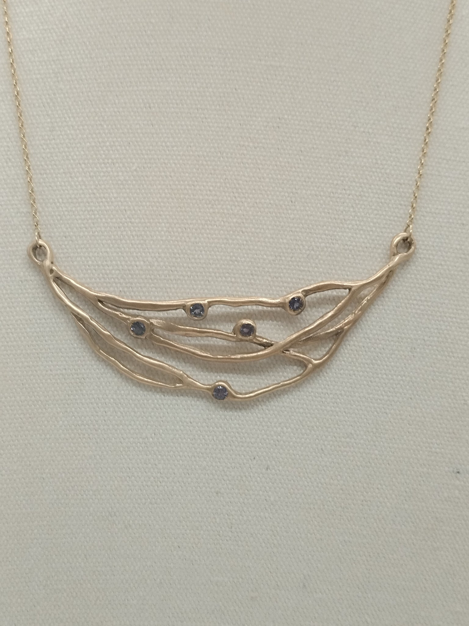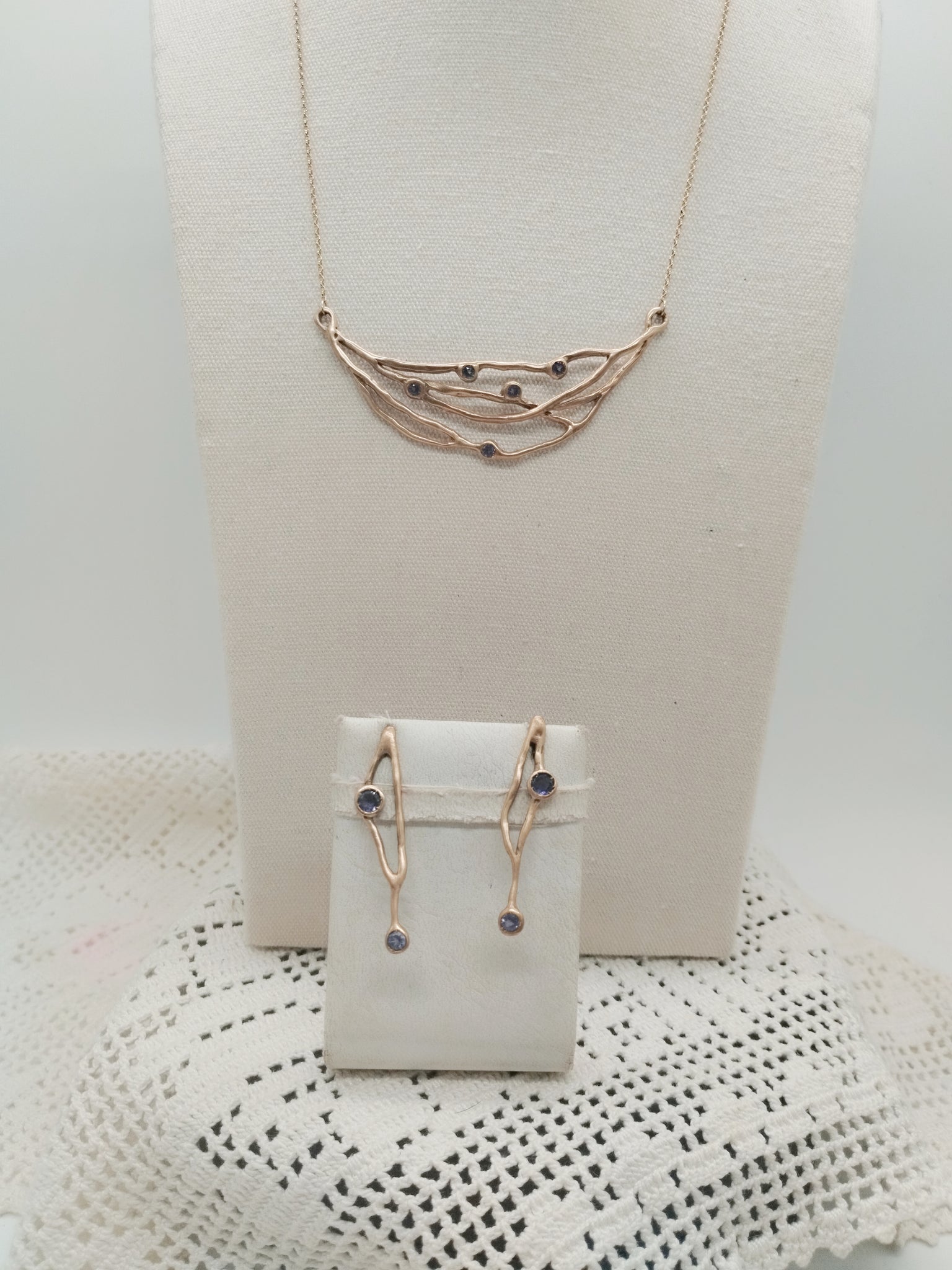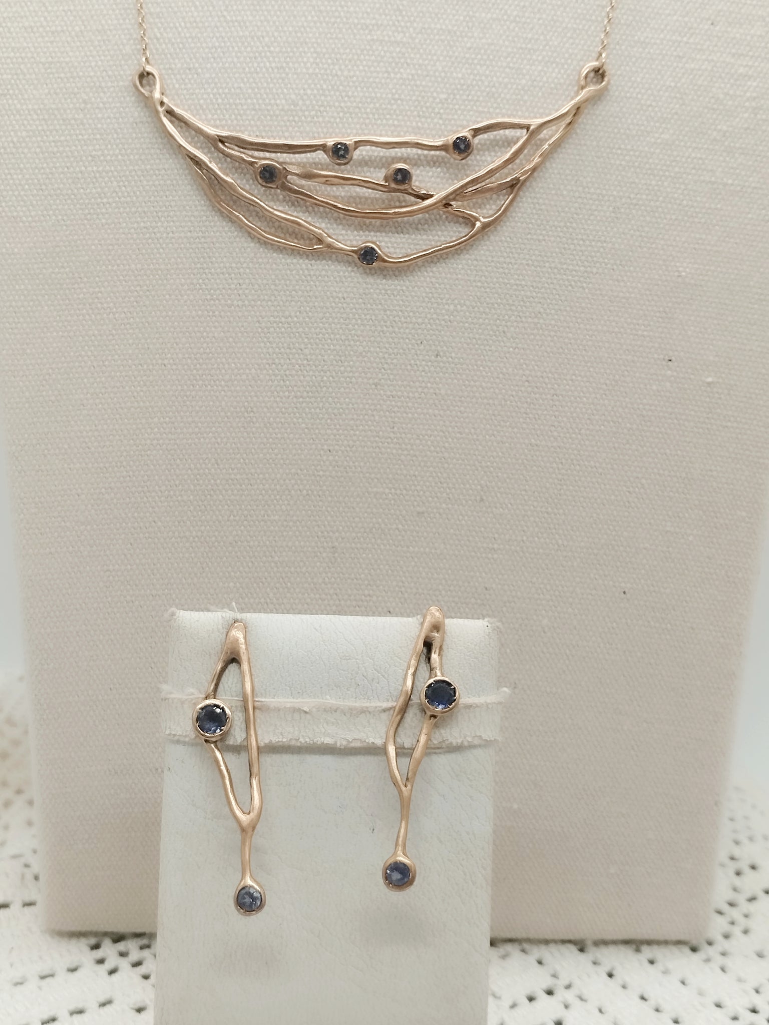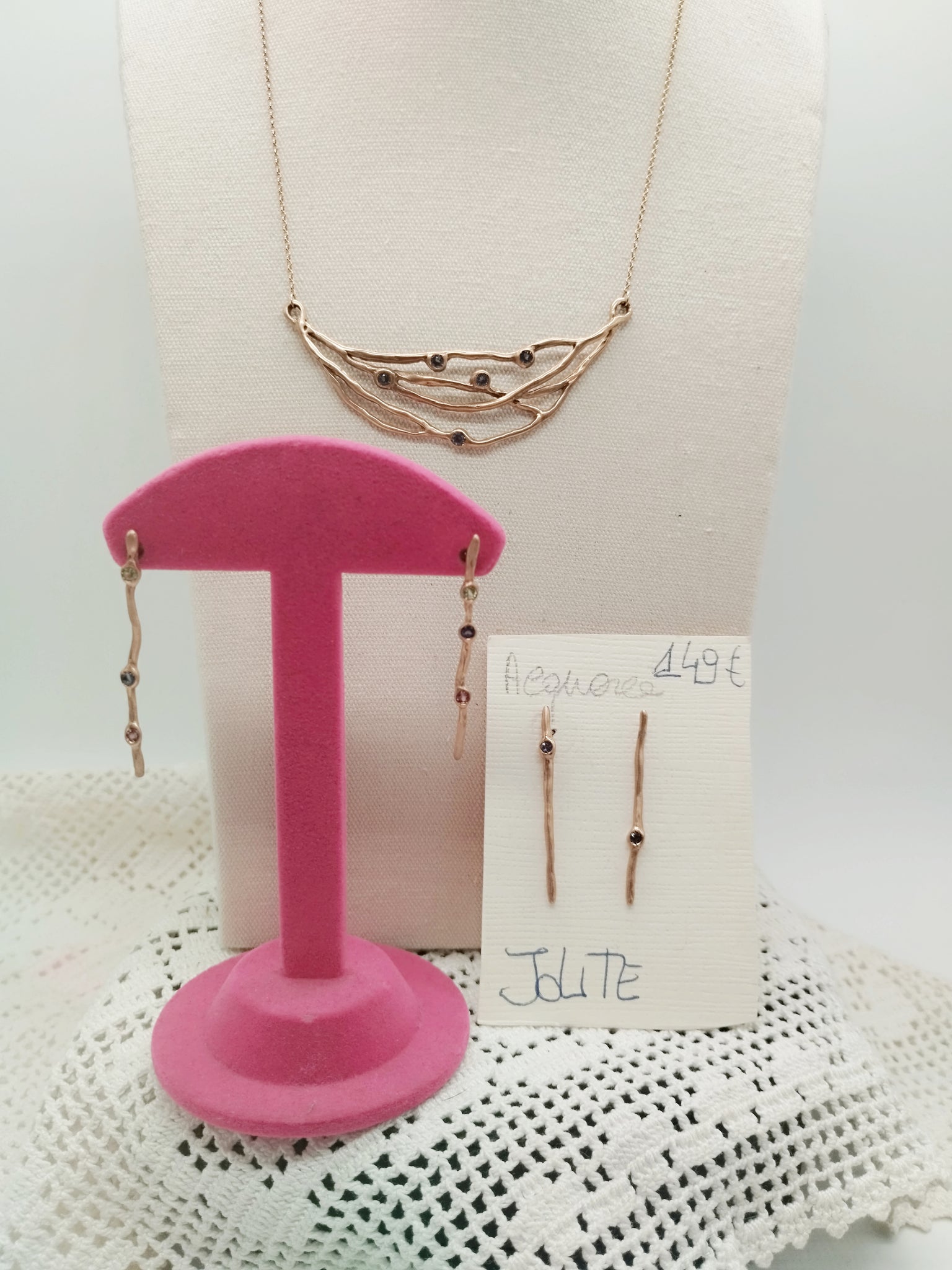 Questa serie si chiama ALGHE ed è una linea molto romantica, raffinata e intima. Ricorda elementi marini oppure dei piccoli ramoscelli di un' albero, resi luminosi da queste stupende Jolite, una pietra il cui colore, le sue sfumature, vanno dal viola al celeste.