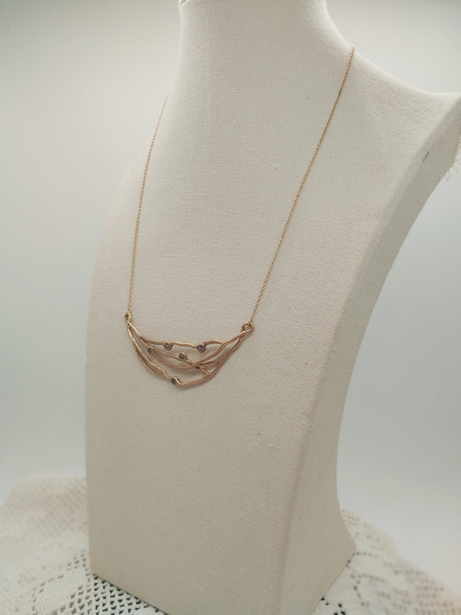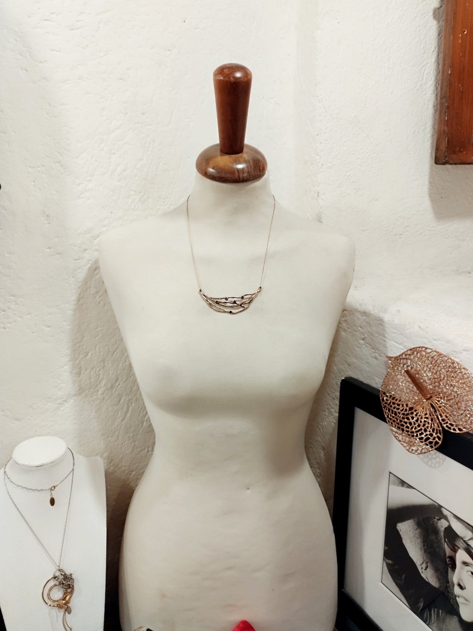 I suoi gioielli sono molto materici, organici, ricordano delle piccole sculture che avvolgono delle pietre semipreziose.