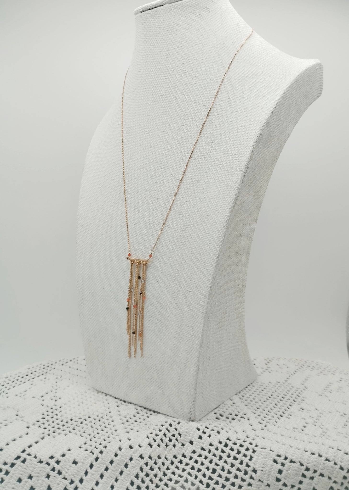 Questa collana ha come elemento centrale tanti fili sottilli, illuminati da piccolissime pietre: spinello nero, corniola, agata rossa. È una collana estremamente chic, raffinata e iper femminile. Per una donna dall' animo gentile.