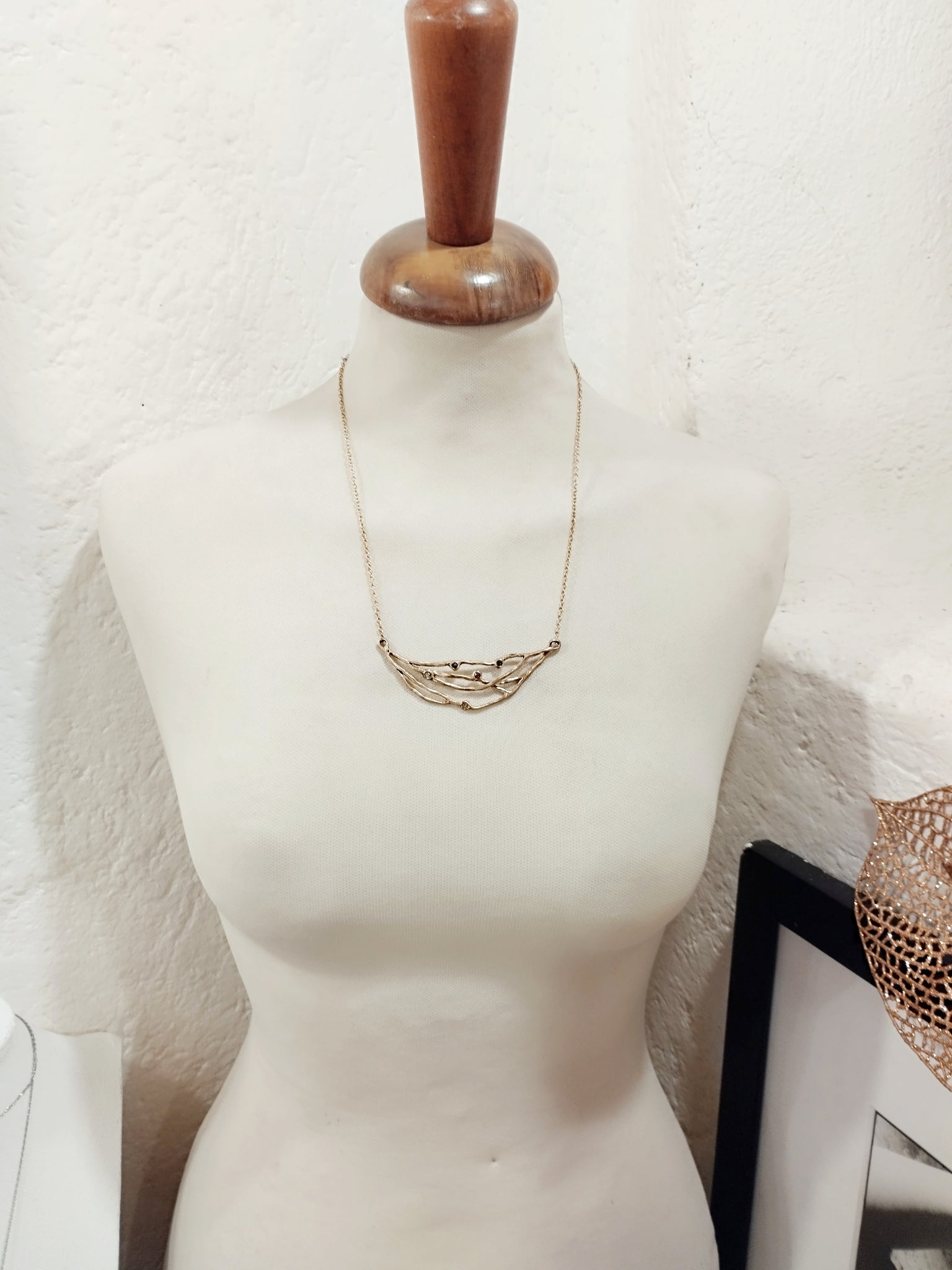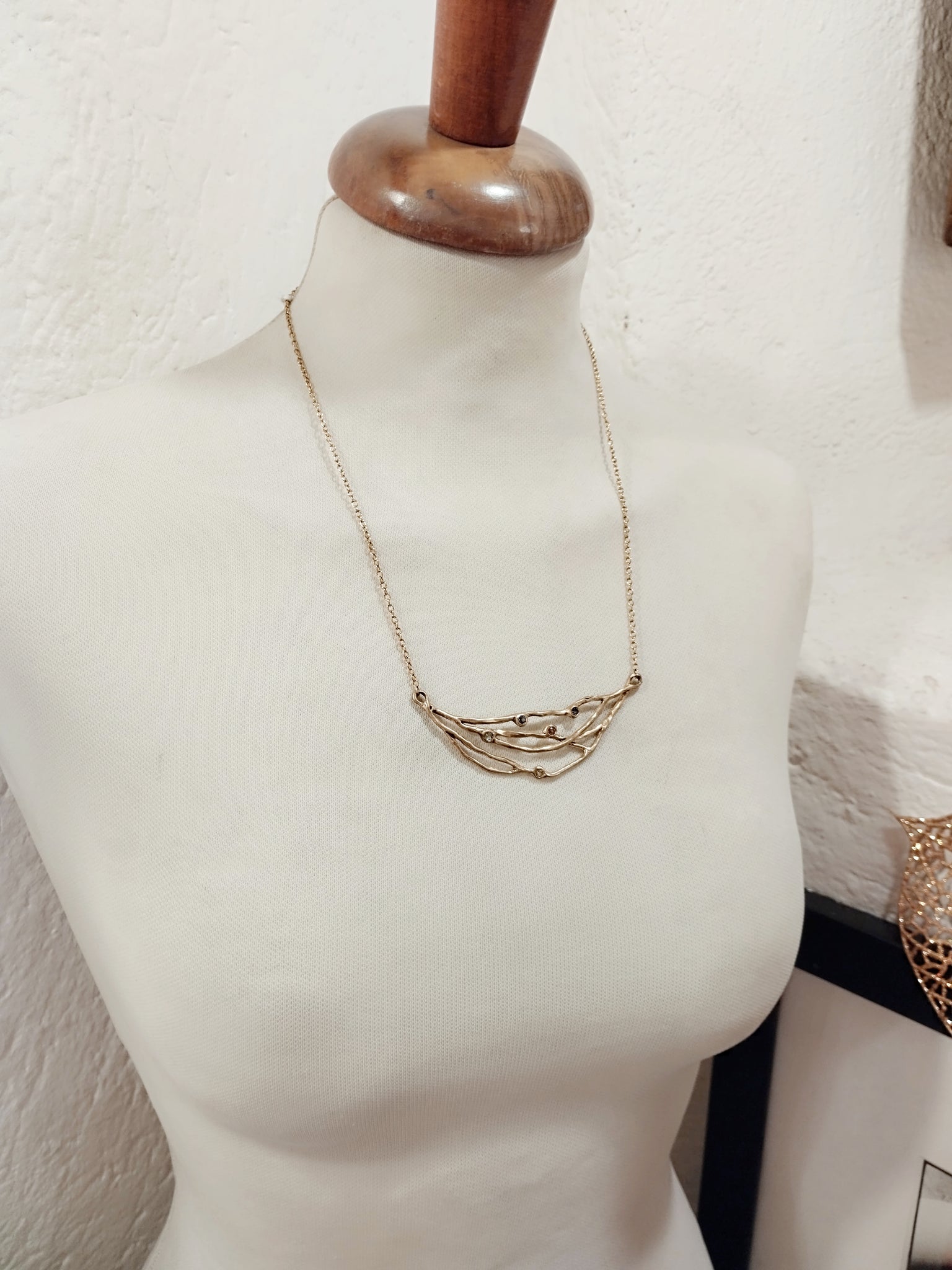 I suoi gioielli sono molto materici, organici, ricordano delle piccole sculture che avvolgono delle pietre semipreziose.