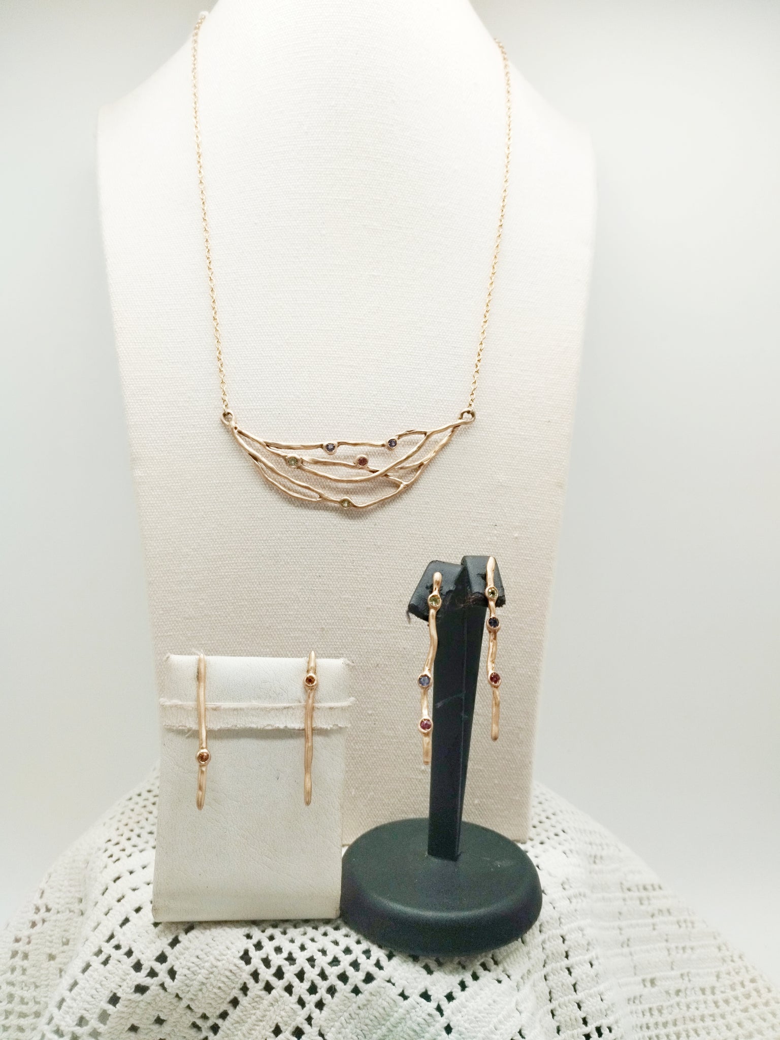 Questa serie si chiama ALGHE ed è una linea molto romantica, raffinata e intima. Ricorda elementi marini oppure dei piccoli ramoscelli di un' albero, resi luminosi da queste  stupende pietre che sono verde Peridoto, Jolite sul viola celestino, Rodolite sul rosso rosato.