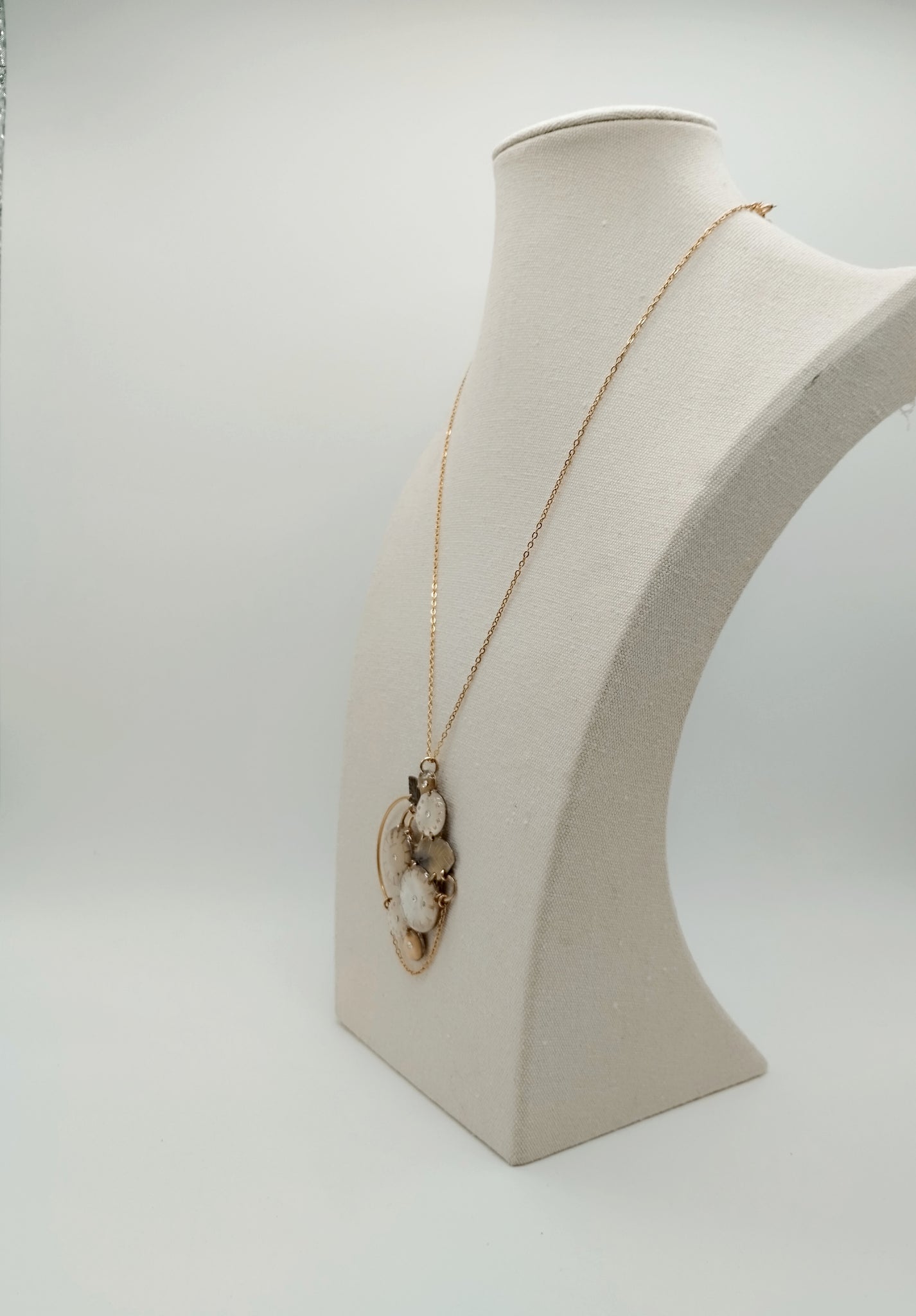 Questa versione di collana è molto articolata e strutturata, è una vera e propria composizione. Piace tanto la catenina gold filled che penzola.
